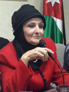 وفي قصيدة “تحية فخر” نجدها تفتخر بالأردن قيادة وشعبا فتقول: “وجيوشنا درع يصد المعتدي.. من رحم شعب مخلص متسامي”، وتمدح جلالة ملك الأردن في قصيدة “جرش الأصالة” فتقول: ملك الملوك دعا وأعلى شأنها.. كي يحفلوا في شمسها وظلالها”، وفي قصيدتها “دمع النوى” تمدح الشهيد منذر بالقول: “يا منذرا تعلو السماء برفعةٍ.. يا نهر شهدٍ يرتجيه فطامي”، ونجد المديح في قصيدة “اصح يا نايم” في مديح شهر رمضان، وفي قصيدة “ناصر الاسلام والمسلمين” في مدح الرسول محمد عليه أطيب الصلاة والسلام، والمديح لمليك الأردن في قصيدة “عيد سعيد”.