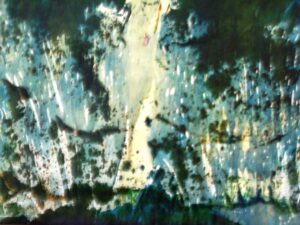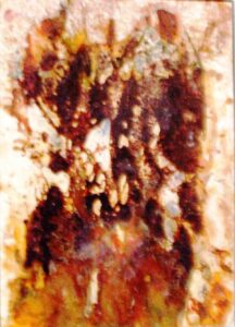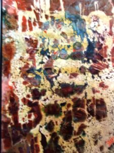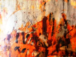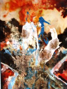 في اللوحة الثانية، تمازجت الألوان مع مادة “بلاستيكية”، وطغى اللون القاتم على المشهد، إضافةً إلى سيطرة اللون الأحمر ومشتقاته الحارة كالبرتقالي، بينما على يسار اللوحة اعتمد الفنان على مزج قطع من الخيش مع الألوان، وتدرجات الأسود والبني والأزرق والأبيض. كانت اللوحة حافلة بالرموز اللونية؛ على يسارها بدا كأن هناك شخصين يتصارعان يغلب عليهما الأزرق، بينما الخيوط العنكبوتية متناثرة في اللوحة، وكأنها تشير إلى حدث قادم. ومع ذلك، برزت طاقات الانفراج بلون الشمس في أكثر من موقع، إلى جانب أشكال أشبه بأشخاص، وكأنهم أدوات الثورة والمستقبل.